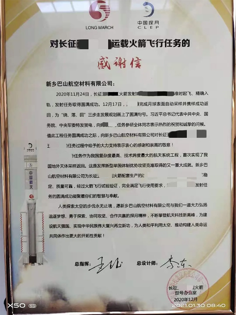 近日,新鄉(xiāng)巴山航空材料有限公司收到運(yùn)載火箭型號(hào)辦公室發(fā)來的感謝信,信中對(duì)我公司為某運(yùn)載火箭飛行任務(wù)做出的貢獻(xiàn)表達(dá)了感謝。